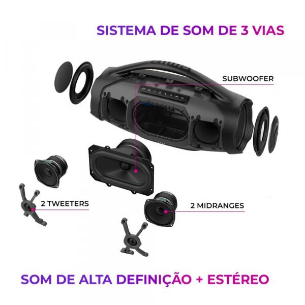 SOM DE ALTA DEFINIÇÃO COM 3 VIAS: Projetado com o sistema de som de 3 vias, a Boombox Plus possui 1 subwoofer, 2 midrange e 2 tweeters, além de 3 amplificadores de áudio um para cada canal (grave, médio e agudo).