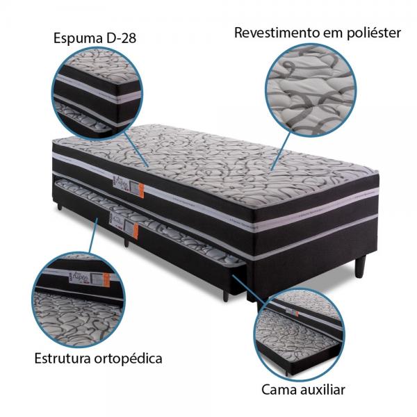 Revestimento Tampo Superior: Tecido poliéster + Espuma D20 1 cm Matelassê Revestimento Faixa Lateral: Poliéster 92 g/ M2 + Espuma D20 Matelassê