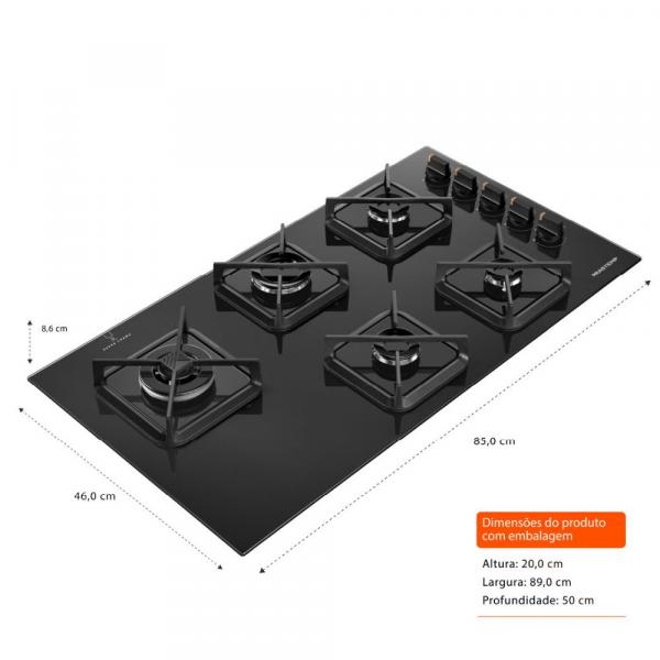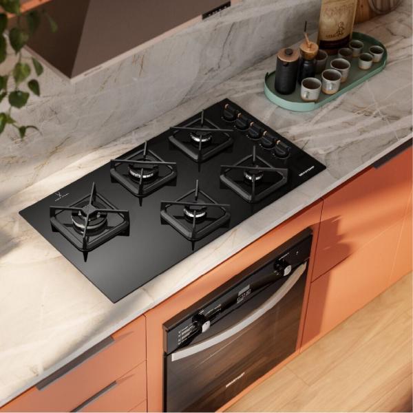 O cooktop Brastemp 5 bocas BDS85AE é a escolha ideal para quem busca alto desempenho aliado a um design sofisticado. Com acabamento em vidro preto e detalhes modernos, ele transforma a cozinha em um ambiente mais elegante e funcional.