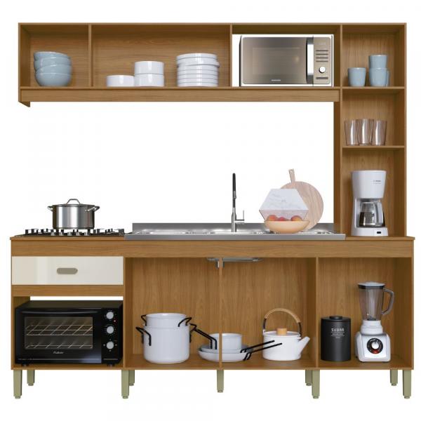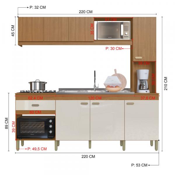 Cozinha com módulos independente de fácil arranjo, pintura fosca fácil de limpar e amplo espaço interno. Produzido em chapas de 12 E 15mm, pintura “UV”Ultra-violeta em tons madeirados, dobradiça metálica com regulagem, corrediça metálica, puxadores em PVC duro, parafusos especialmente desenvolvidos para fixação em chapas de madeira.
