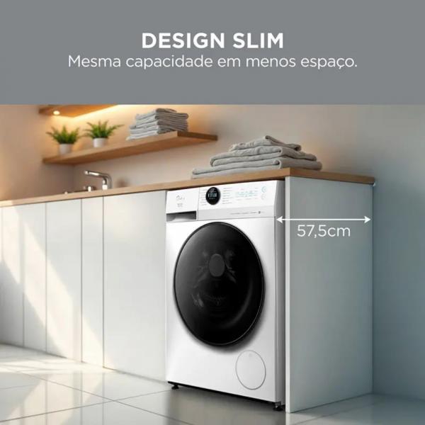Lava e Seca 11kg Slim HealthGuard Conectada Midea: mesma capacidade em menos espaço. Com design compacto e moderno, possui dimensões reduzidas que otimizam espaço sem comprometer a capacidade e eficiência da máquina.