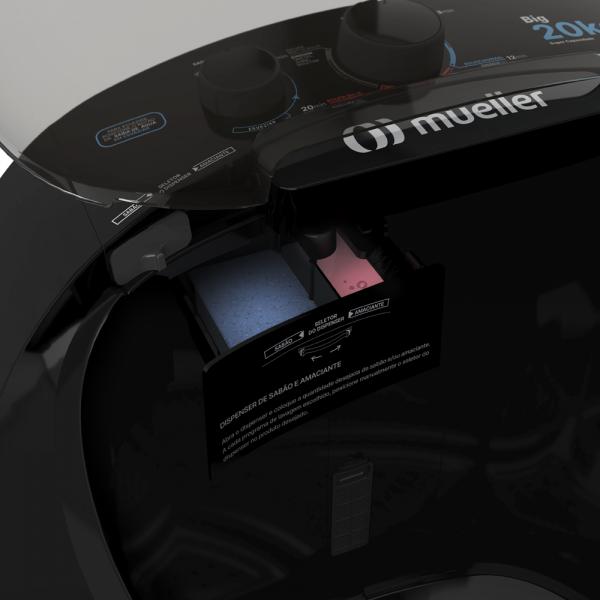 Possui dispenser para sabão e amaciante com medidor e seletor