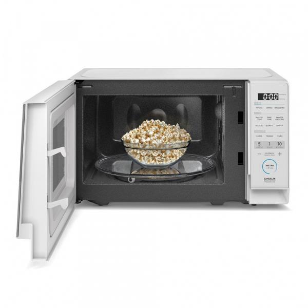 O micro-ondas também conta com 3 receitas pré-programadas (pipoca, arroz e brigadeiro) e 10 níveis de potência que permitem ajustar o preparo conforme o tipo de alimento, enquanto a função descongelar por tempo para carne, frango e feijão, garante eficiência sem riscos de cozimento parcial.