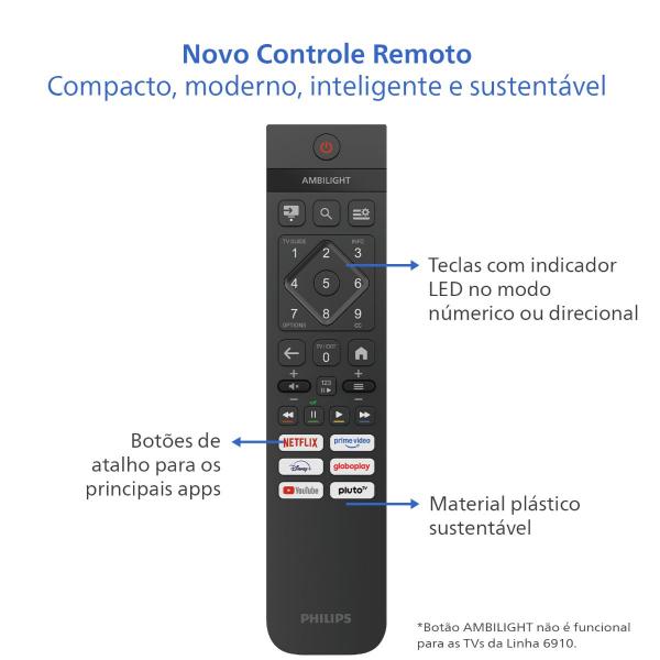 Características do controle remoto: Controle Remoto com atalho para Netflix, YouTube, Prime Video, Disney+, Pluto TV e Globoplay